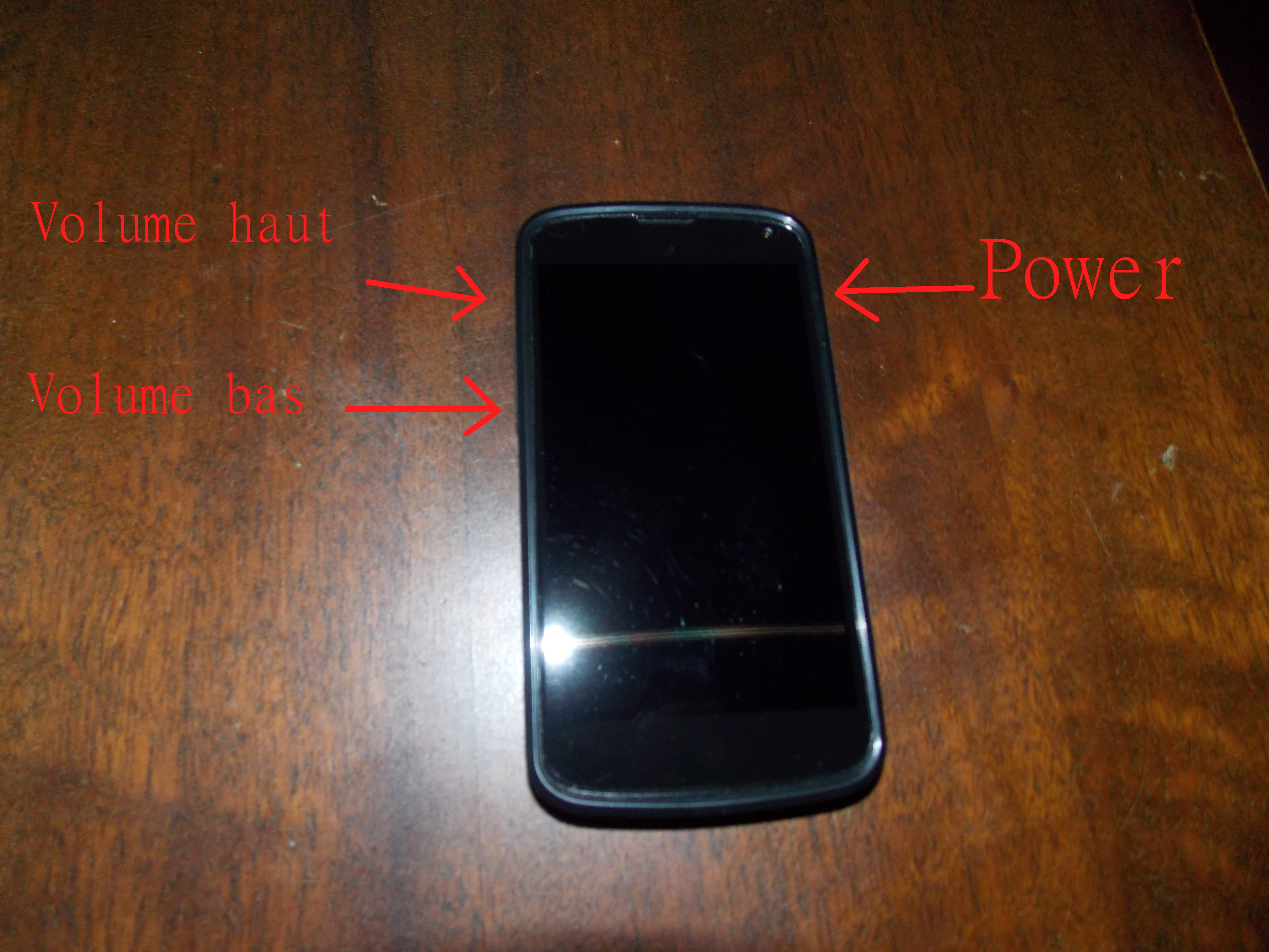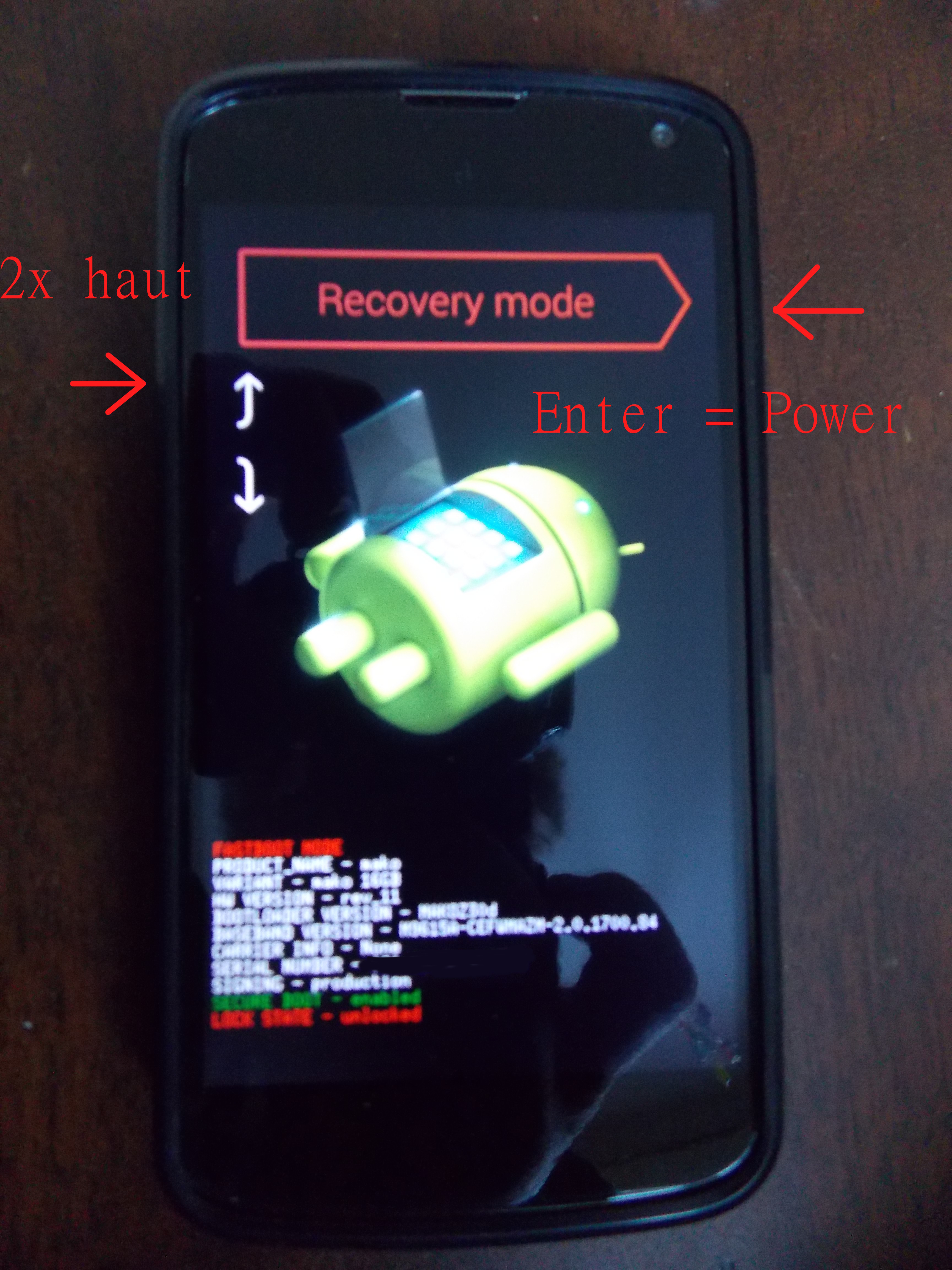 1. Ouvrez votre appareil en mode Fastboot, c’est-à-dire en appuyant simultanément sur les touches POWER, VOLUME HAUT et VOLUME BAS dans le cas de mon Nexus 4. C’est la combinaison classique, mais vous pouvez faire une petite recherche sur le net pour savoir comment ouvrir ( ou booter) votre appareil en Fastboot.étape1
