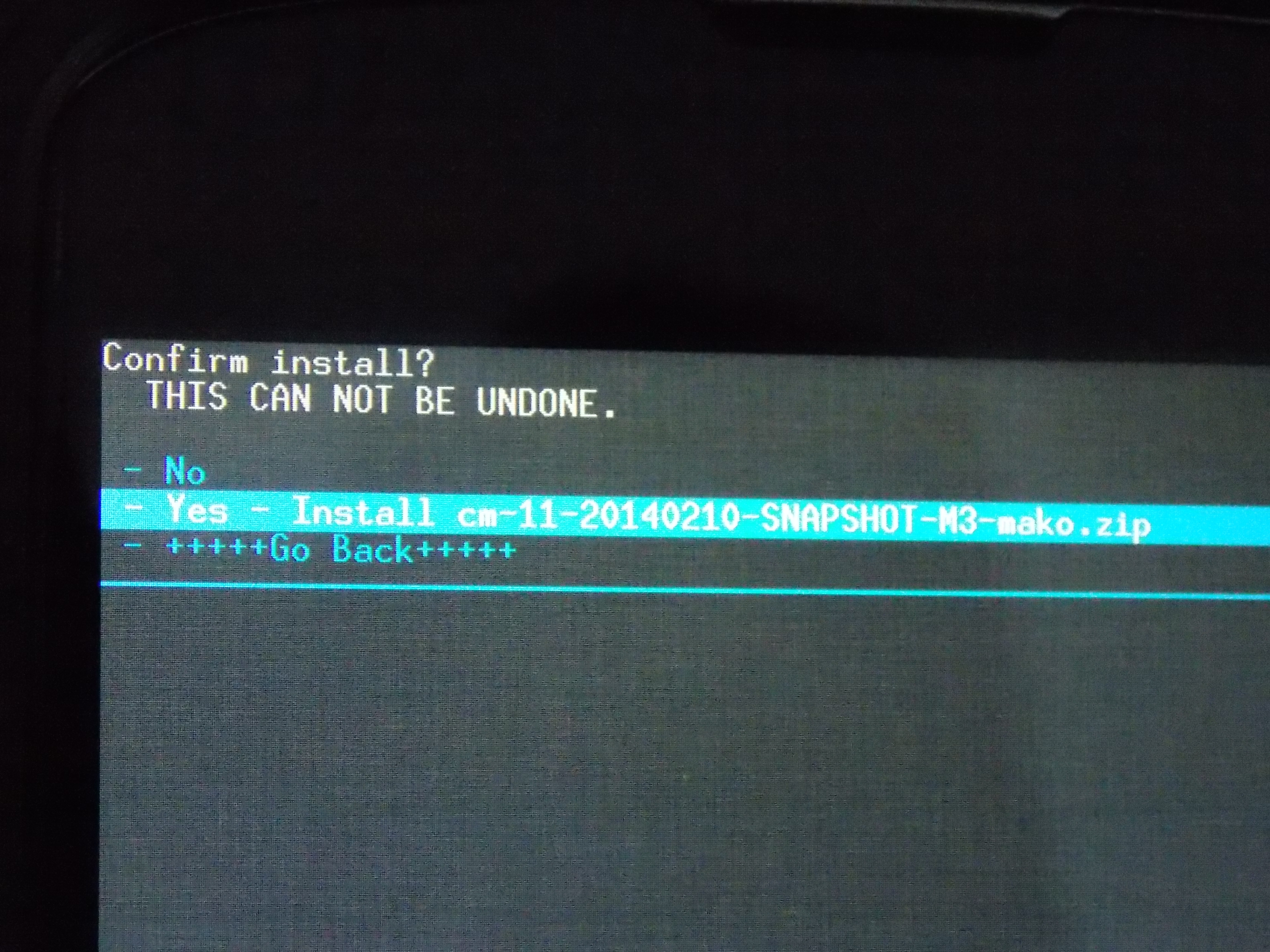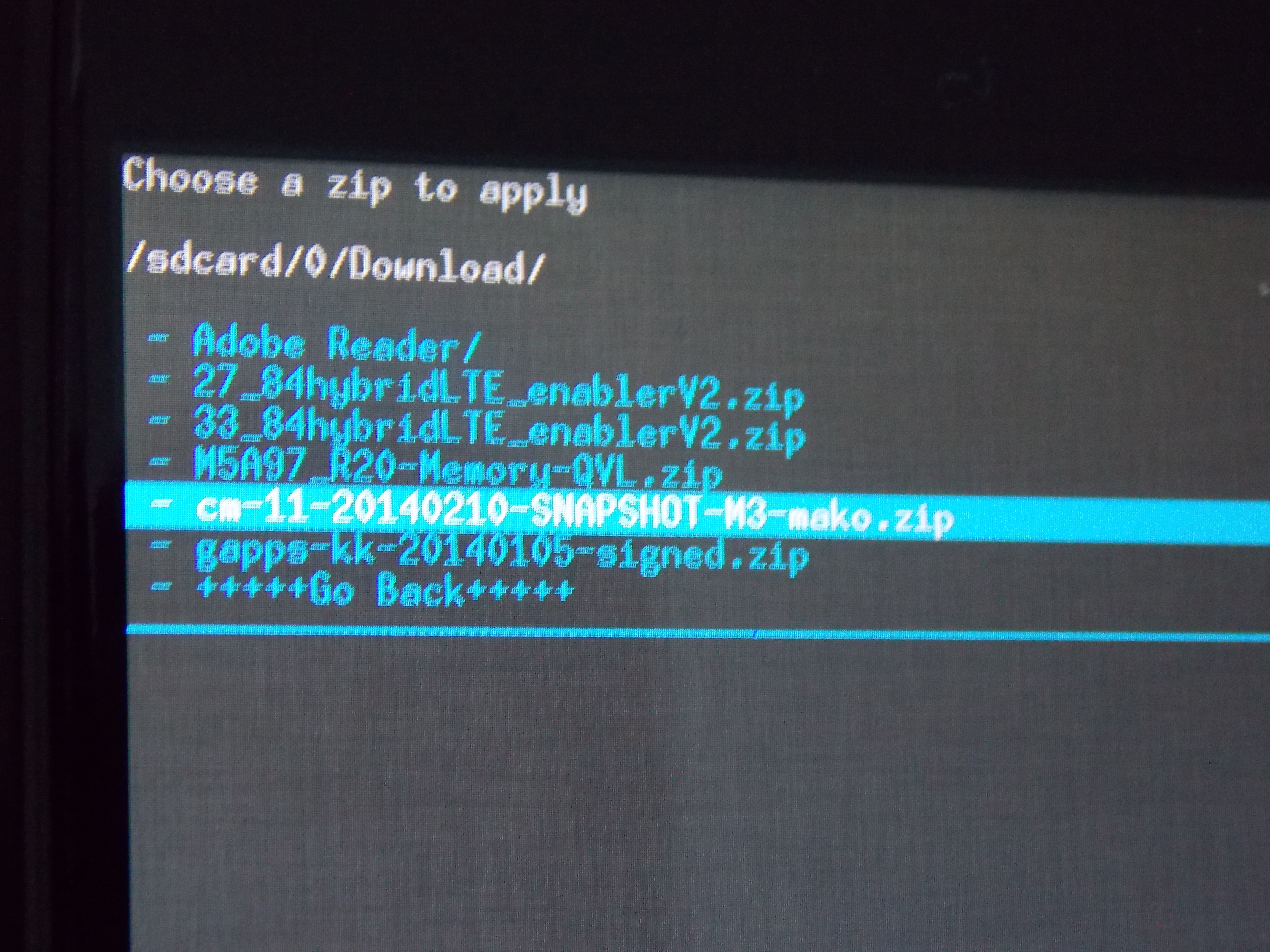 5. Une fois que vous aurez tout « wipé », il sera le temps de flasher votre rom. Allez à  Install zip, sélectionnez Choose zip from /sdcard et rendez vous à votre fichier .zipétape6étape7étape8étape9étape10étape11Une chose très importante à savoir avant de redémarrer votre appareil est qu’il faille installer les Gapps. Vous n’aurez qu’à refaire tout le chemin jusqu’à l’endroit dans lequel vous aurez téléchargé les Gapps et les installer sans rien wiper de nouveau après le flash de votre rom. Pour ma part, j’ai flashé le fichier cm-11-20140210-SNAPSHOT-M3-mako.zip, puis j’ai flashé gapps-kk-20140105-signed.zip.
