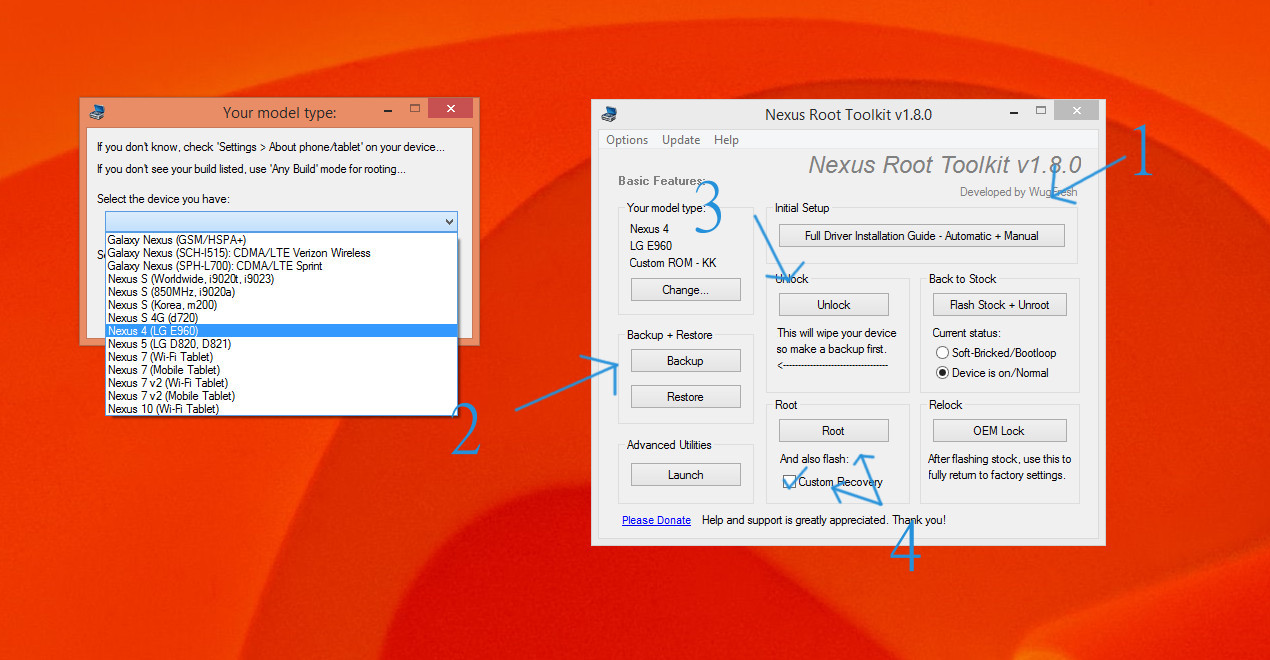 Il vous faudra nécessairement rooter votre Nexus 4. Pour ce faire, le développeur Wugfresh créa son propre programme pour PC nommé le Nexus Root Toolkit. Ce programme sert à rooter tous les produits Nexus depuis le Samsung Nexus S. Vous trouverez les explications de Wugfresh ainsi qu’un lien de téléchargement venant du site de Wugfresh sur les forums de XDA en cliquant ici