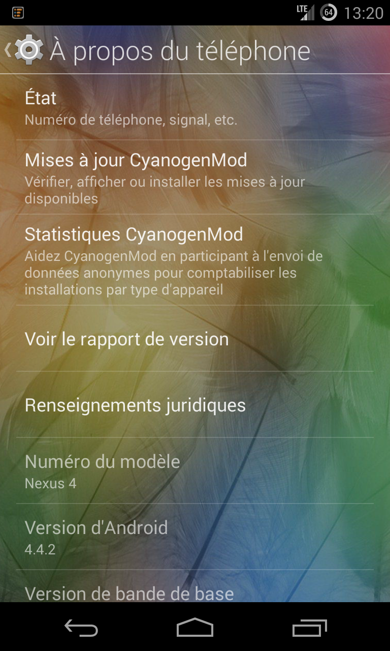 D’un côté un peu plus technique, il n’y aurait que la Bande 4 LTE qui serait accessible. Si cette bande n’est utilisable qu’avec T-Mobile aux État-Unis, nous au Canada, ce sont toutes les compagnies de télécommunications qui la diffuse; Bell, Rogers, Telus ainsi que toutes leurs sociétés filles (ex: Virgin Mobile avec Bell, Fido avec Rogert et Koodo avec Telus). Le driver qui s’occupe de gérer les signaux de téléphones se nomme radio sous Android. Toutes les versions de radio passé la version 0.33 ne font pas fonctionner la LTE. Si vous avez fait passé votre Nexus 4 à la toute dernière version d’Android, la version 4.4.2 Kitkat, la version de votre radio est la 0.98. Bref, c’est mort pour la LTE selon la méthode douce.