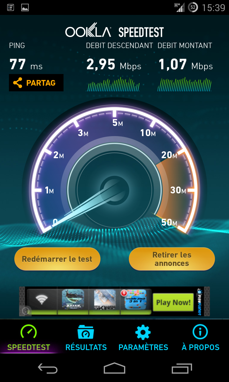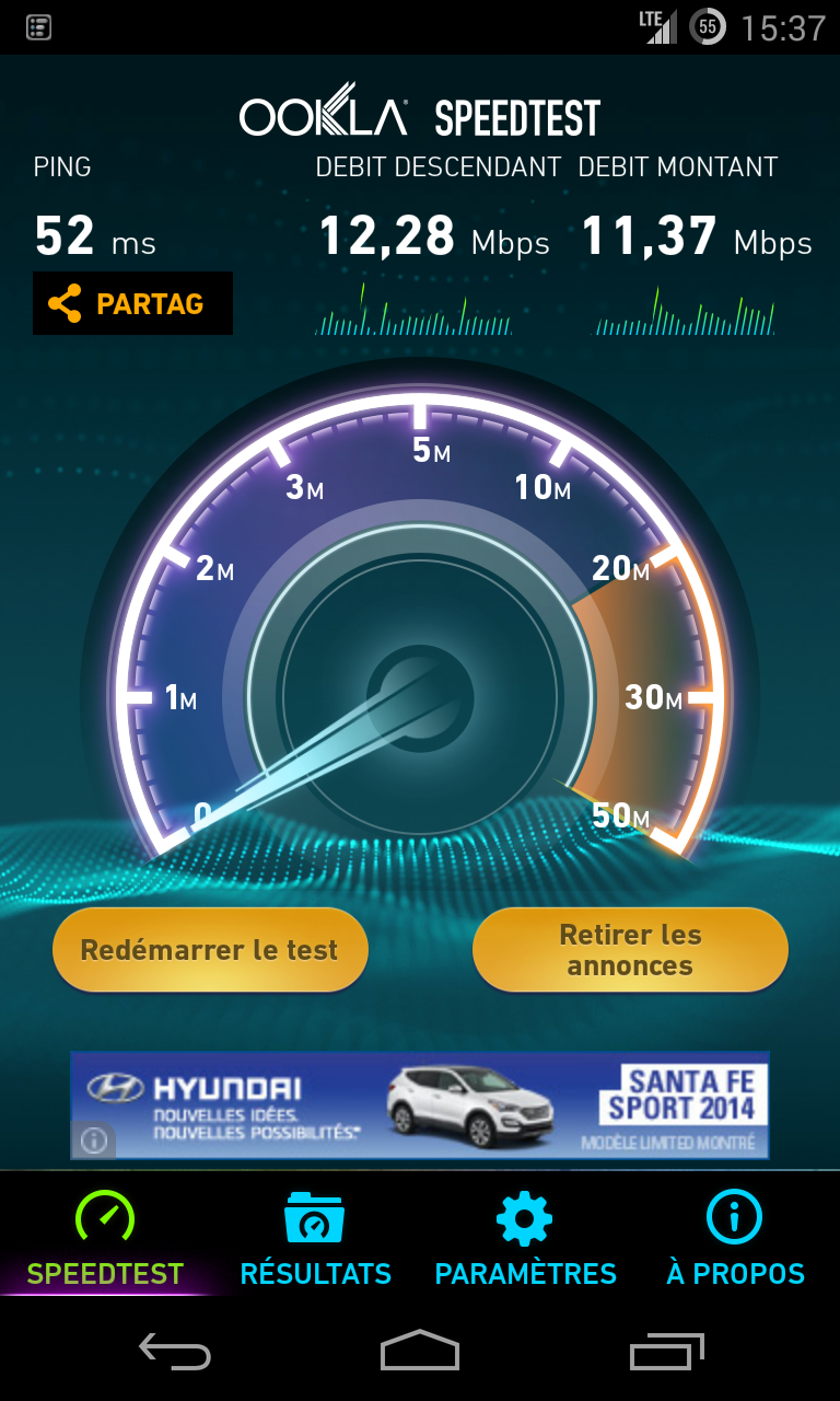 Les résultats pour ce qui est de mon Wi-fi reflètent ce que j’obtiens toujours, c’est ce que Vidéotron nous promet comme vitesses. Par contre, pour ce qui est des réseaux HSPA+ et LTE, je peux obtenir le matin vers 8h à Laval des vitesses de téléchargements d’environ 20Mbps pour le HSPA+ et j’obtiens fréquemment du 45Mps et + sur la LTE, le tout chez Fido. Certes, la LTE n’offre pas une aussi bonne couverture que le 3G, mais lorsque vous pouvez établir la connexion, les vitesses sont phénoménales.